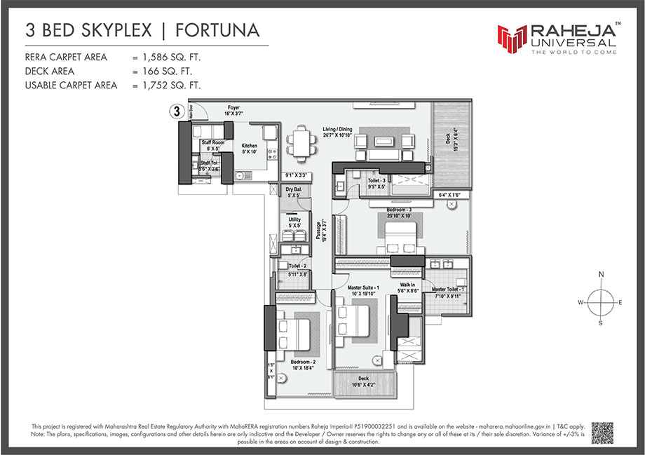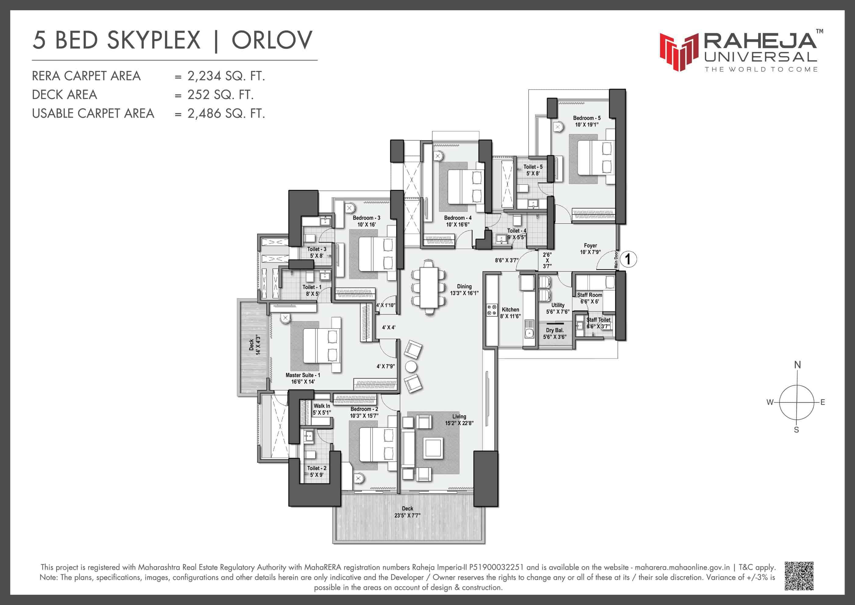 Explore detailed layouts of 3, 4 & 5 BHK Skyplex residences with wrapped decks, ranging from 1,586 to 3,297 sq.ft carpet area